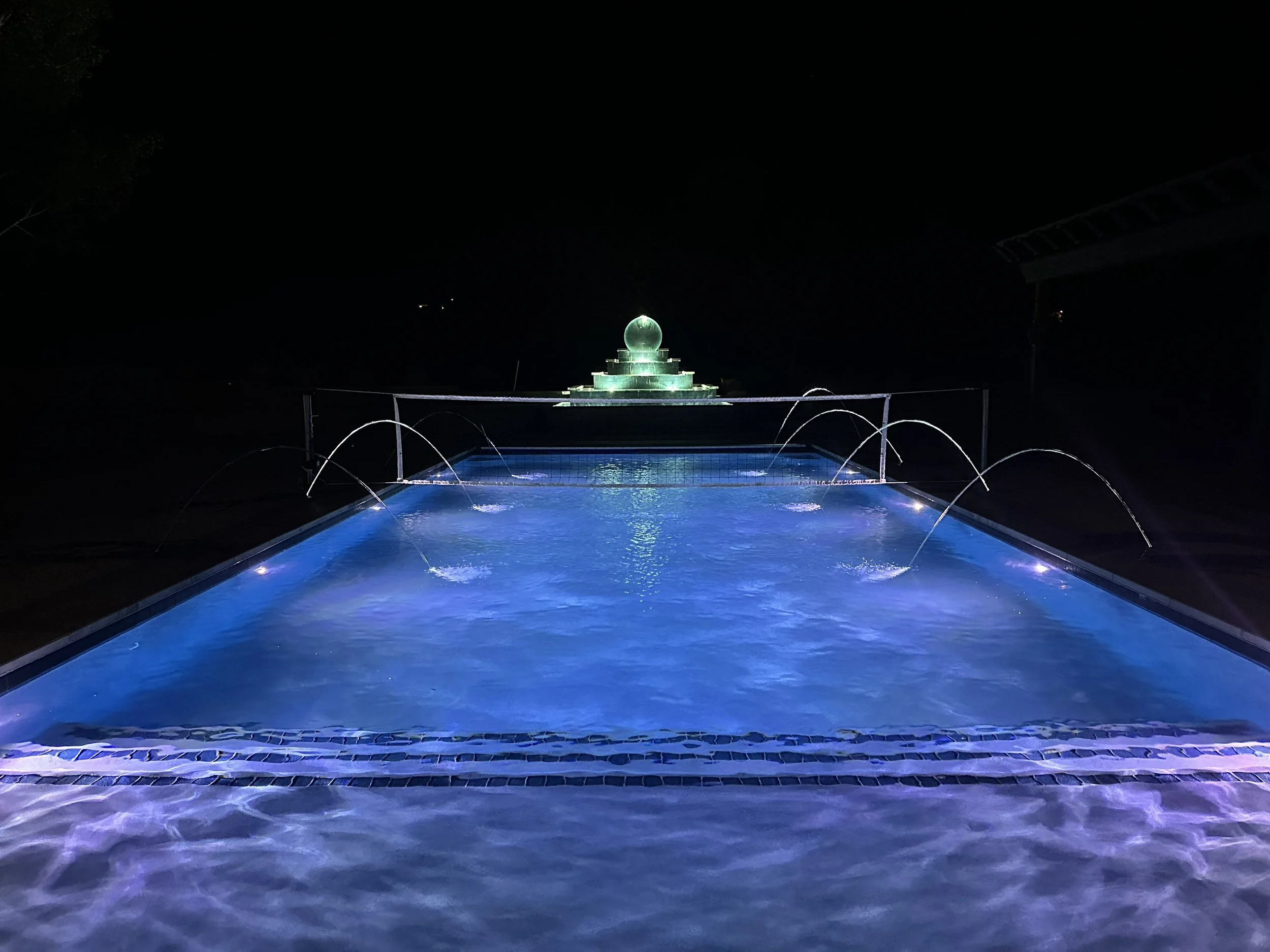 Eight illuminated laminar jets, eight nicheless LED pool lights, and a five-tier negative edge water feature with a custom acrylic sphere create a bold architectural focal point, while an automatic cover adds convenience, safety, and a streamlined finish.